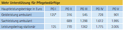 In Zukunft werden körperliche, geistige und psychische Einschränkungen gleichermaßen erfasst. Mit der Begutachtung wird der Grad der Selbstständigkeit gemessen und zu einer Gesamtbewertung zusammengeführt. Daraus ergibt sich die Einstufung in einen Pflegegrad: Mobilität, kognitive und kommunikative Fähigkeiten, Verhaltensweisen und psychische Problemlagen, Selbstversorgung, Bewältigung von und selbstständiger Umgang mit krankheits- oder therapiebedingten Anforderungen und Belastungen, Gestaltung des Alltagslebens und sozialer Kontakte.